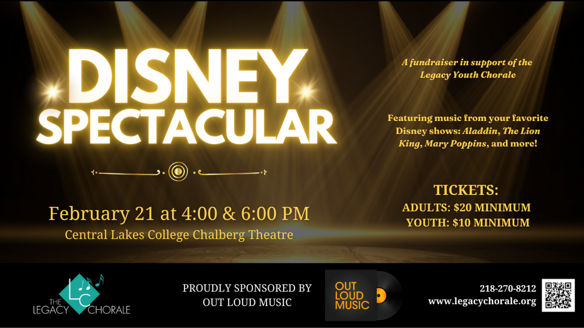 We're excited to bring an exciting evening of Disney magic to the Brainerd Lakes Area! All ages are invited to enjoy solo performances and full choir numbers by members of the Legacy Youth Chorale. Guest performers, special treats, dazzling costumes, and a one of a kind sing-along will make the Disney Spectacular a night you won’t want to miss!
